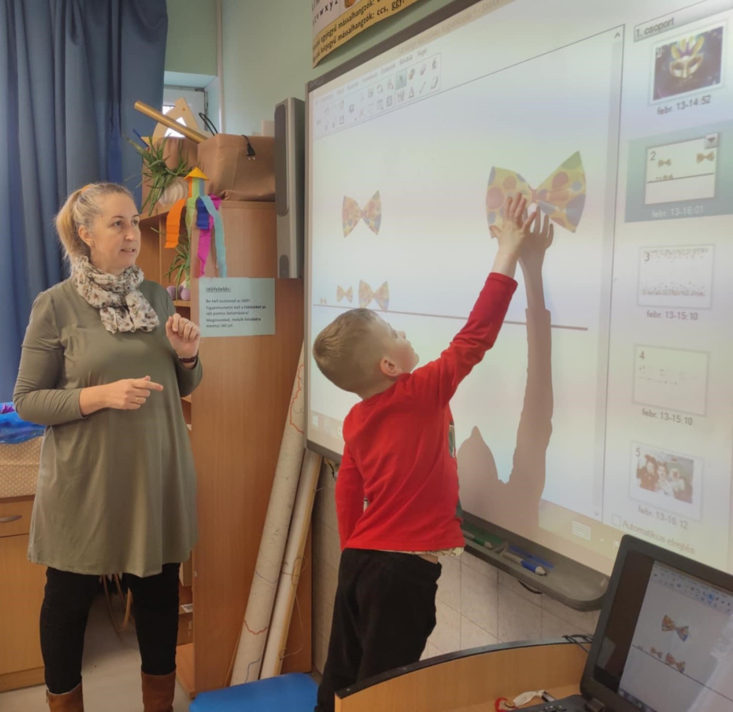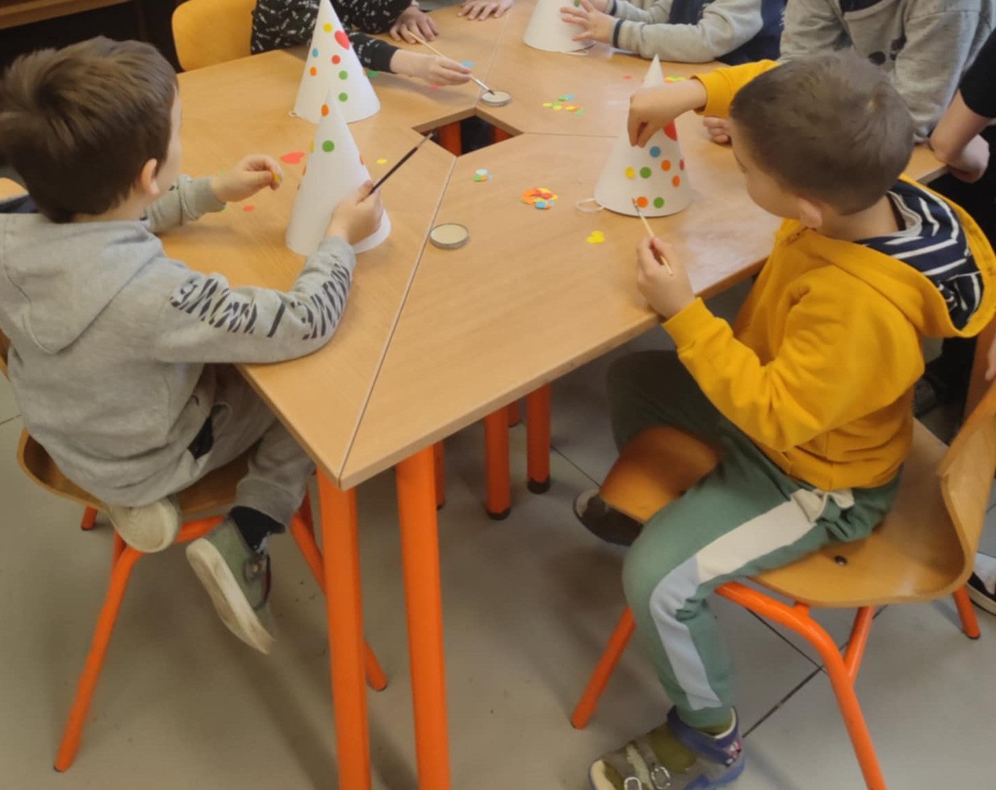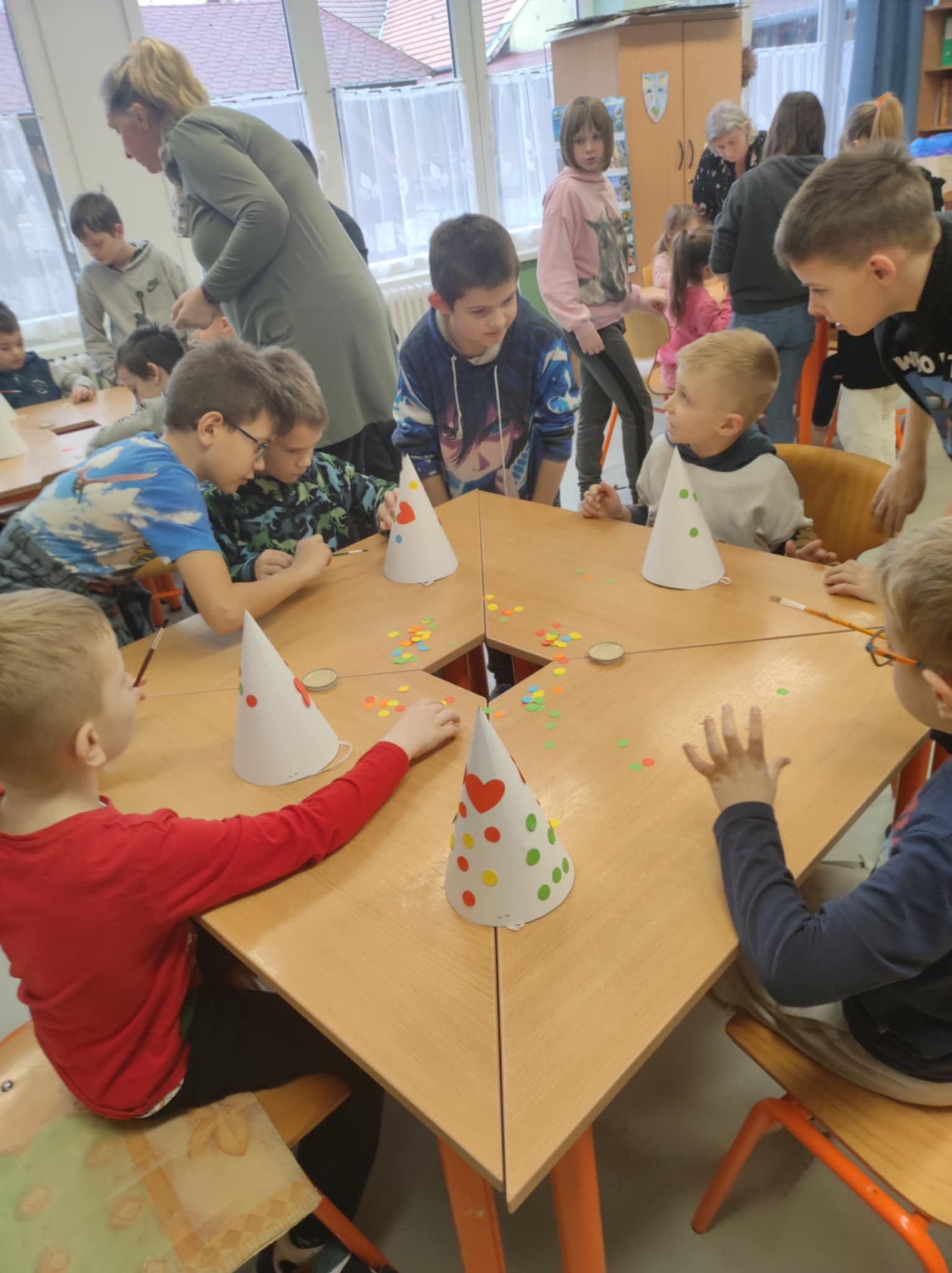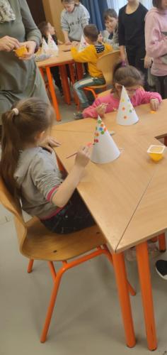 Marianna néni a farsang jegyében építette fel a találkozásokat, így volt olyan foglalkozás, ahol játékos készség- és képességfejlesztő feladatokat csináltak meg együtt ebben a témakörben, de volt olyan foglalkozás is, ahol az ovisok a 4.c osztályos tanulókkal együtt bohóc sapkát készítettek.
